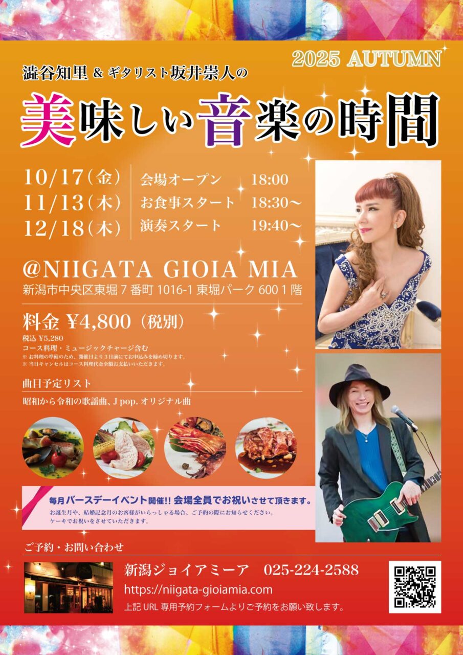 美味しいコース料理と昭和から令和の歌謡曲、Jpop.オリジナル曲を